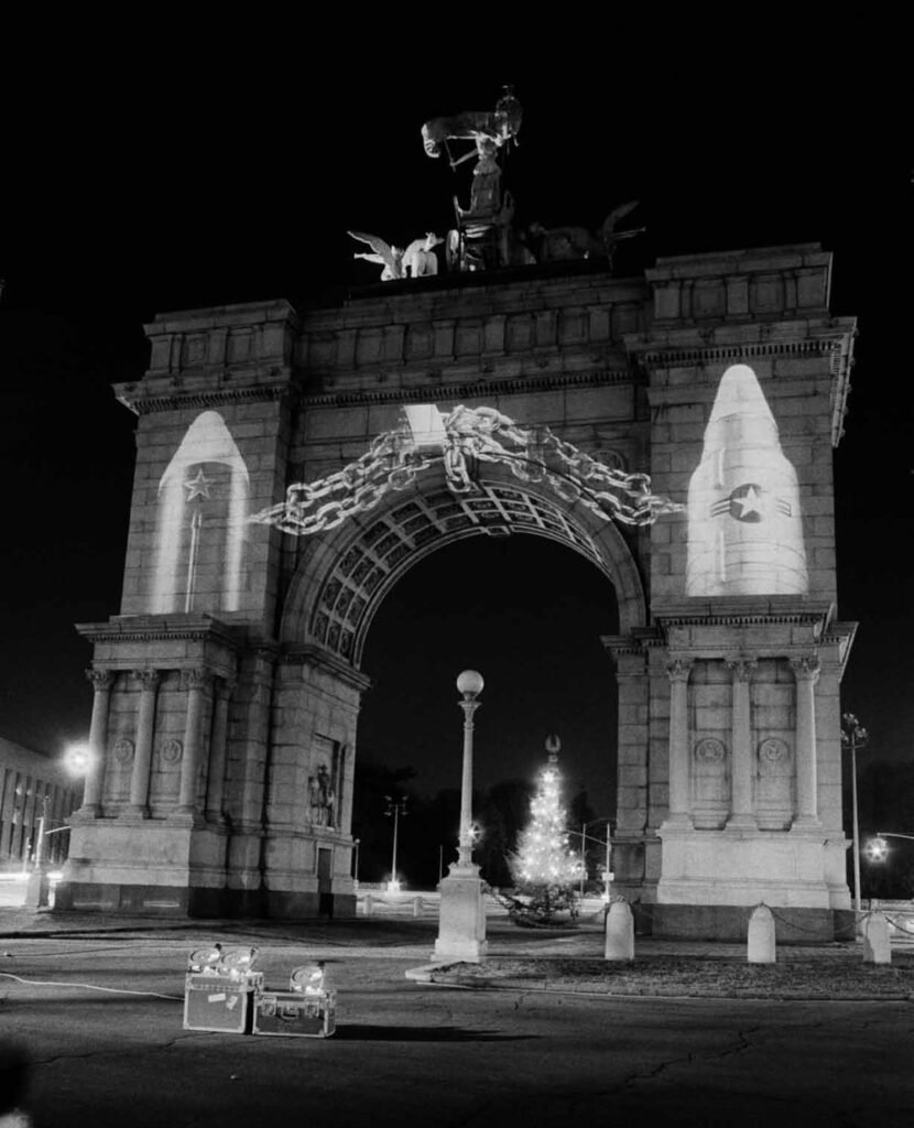 Em 1984, durante as celebrações de Ano Novo no Grand Army Plaza, Brooklyn, o artista Krzysztof Wodiczko projetou na Soldiers and Sailors Memorial Arch a imagem de dois mísseis — um americano e um soviético — ligados por uma corrente com cadeado, em alusão às negociações de redução de armamentos entre EUA e URSS. A projeção dialogava com a arquitetura do próprio monumento, que glorifica o exército do Norte na Guerra Civil, mas também abriga esculturas realistas de soldados exaustos voltando da guerra, criando um raro debate interno no monumento. O público interpretou livremente os símbolos, relacionando-os com o contexto político da época, o que transformou temporariamente o monumento em um espaço vivo de reflexão coletiva.